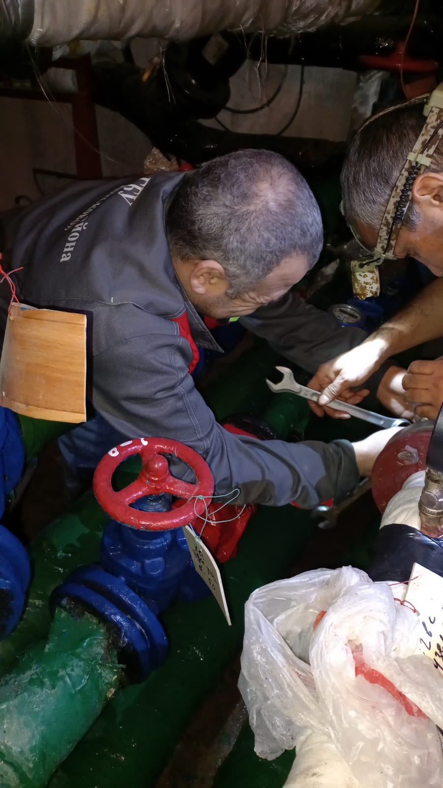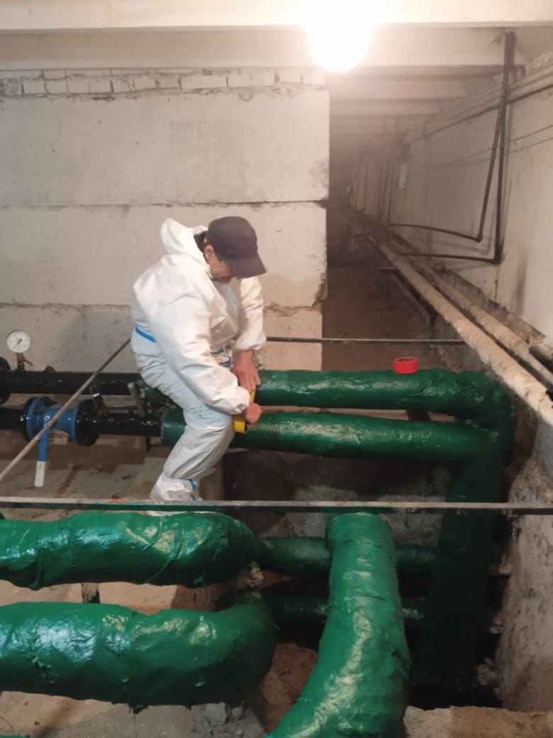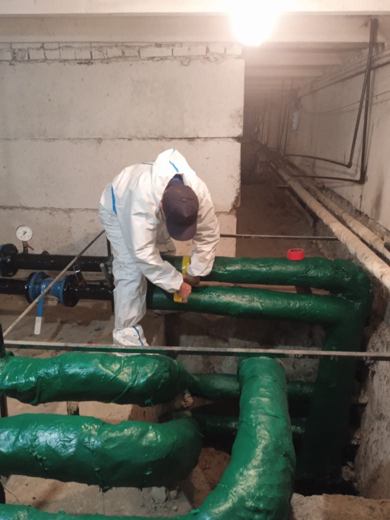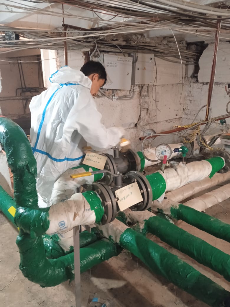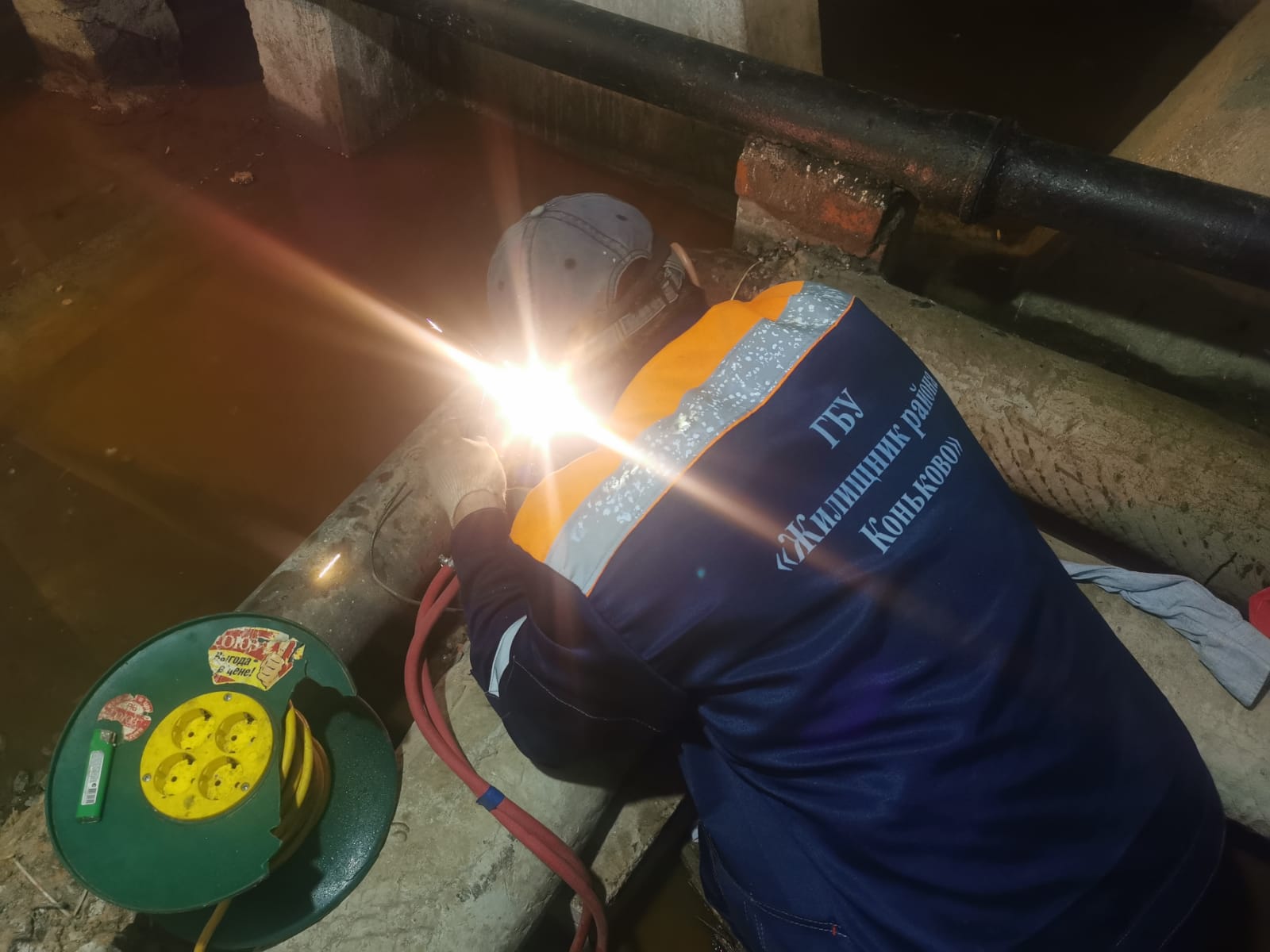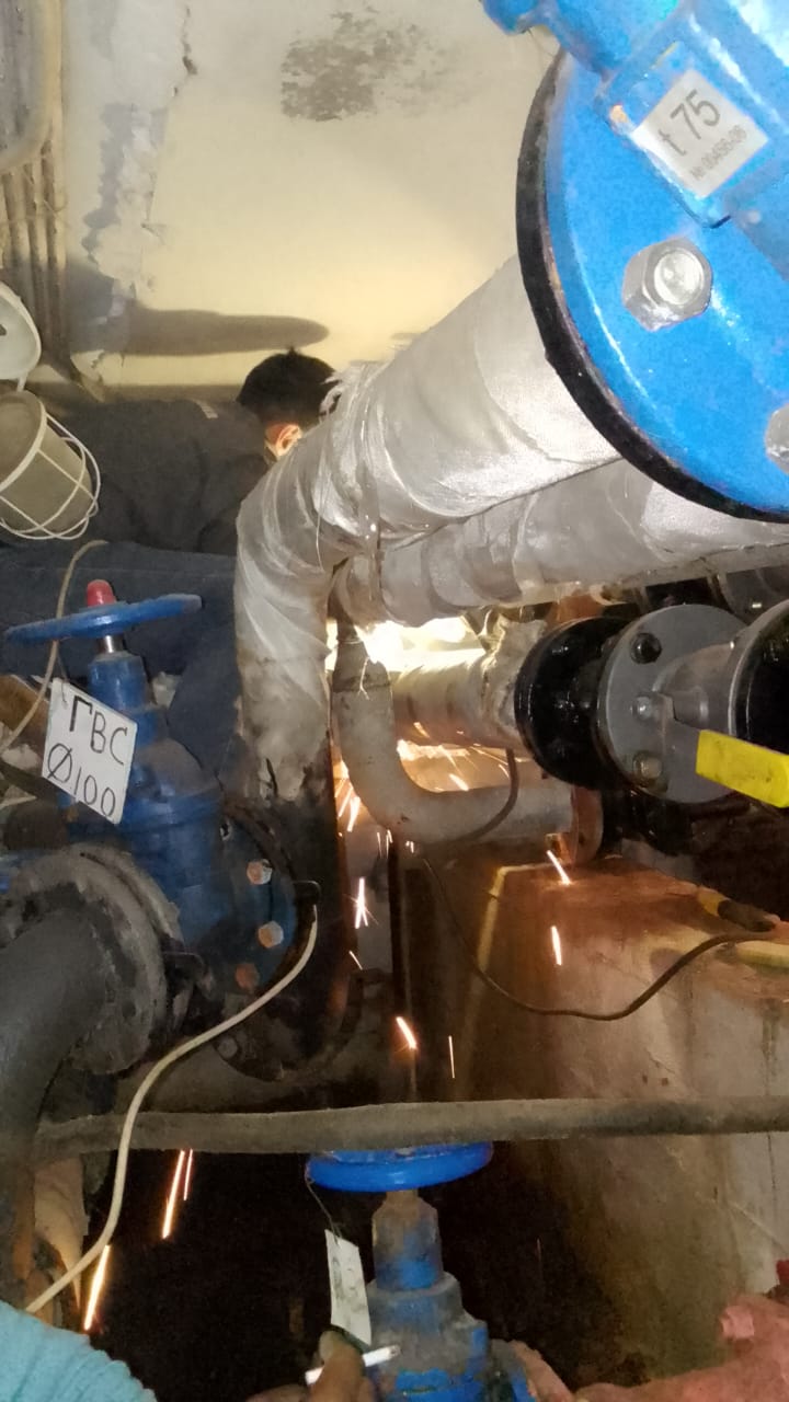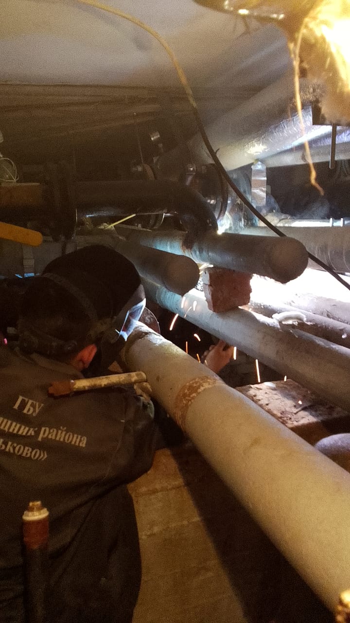 Аварийной службой ведутся сварочные работы по замене трубопровода ГВС в техническом помещении дома по улице Миклухо-Маклая д. 44
