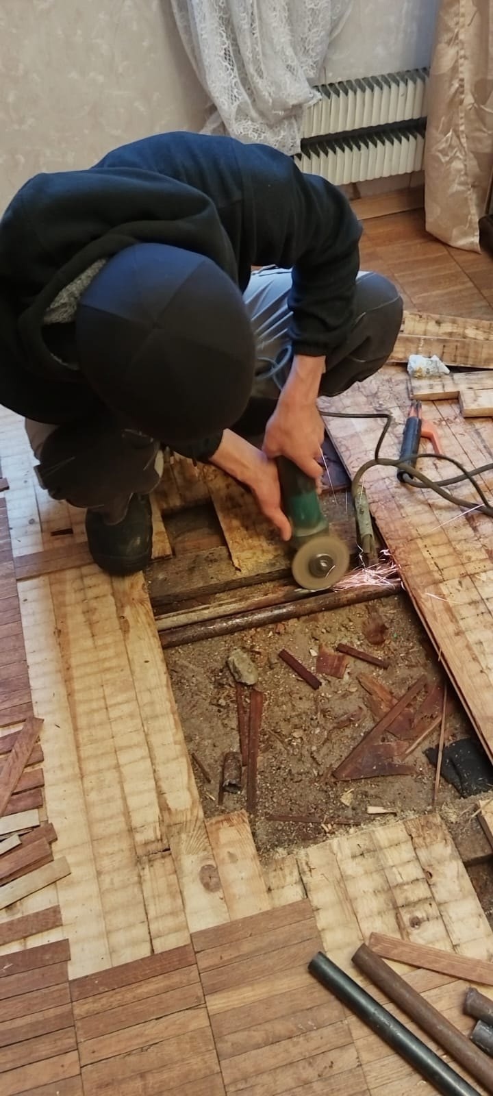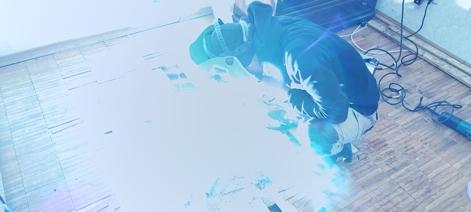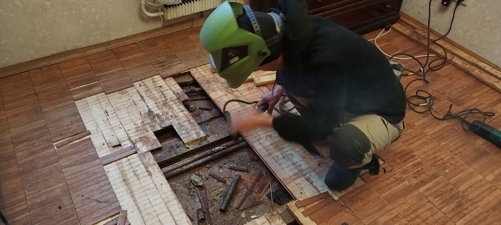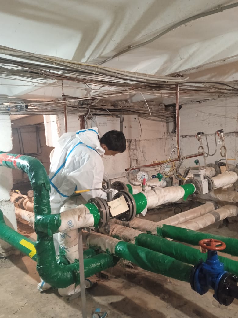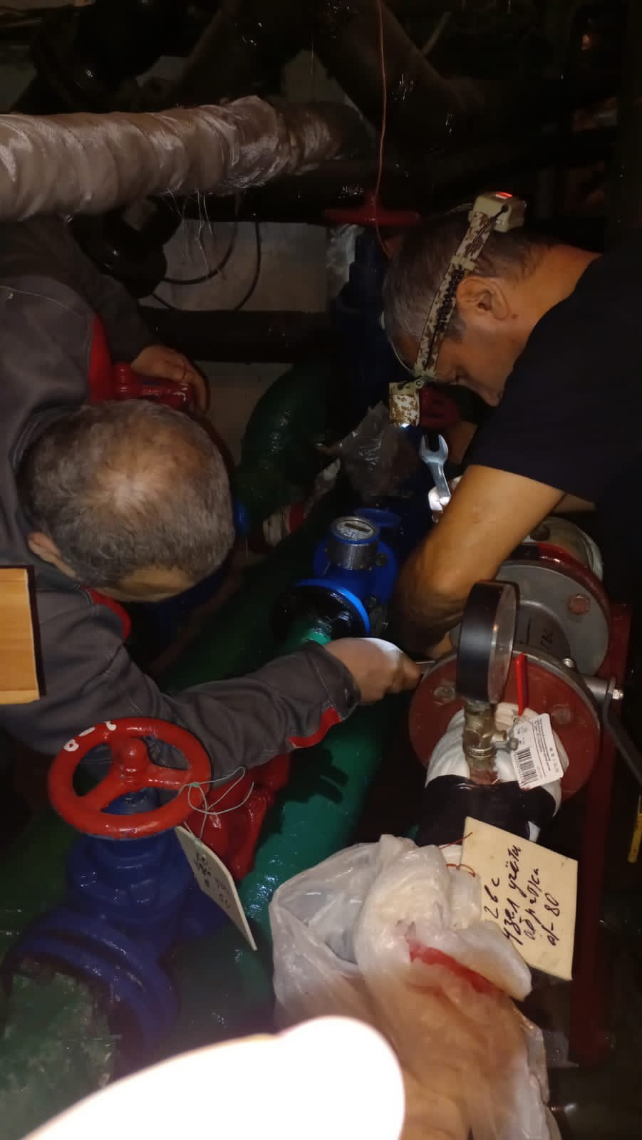 Аварийной службой ведутся сварочные работы по замене трубопровода ГВС в техническом помещении дома по улице Миклухо-Маклая д. 44