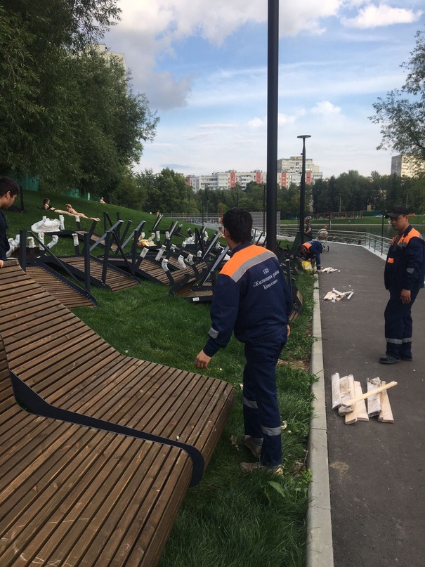 Для комфортного отдыха и время провождения жителей района, сотрудники ГБУ «Жилищник района Коньково» устанавливают шезлонги на Введенских прудах