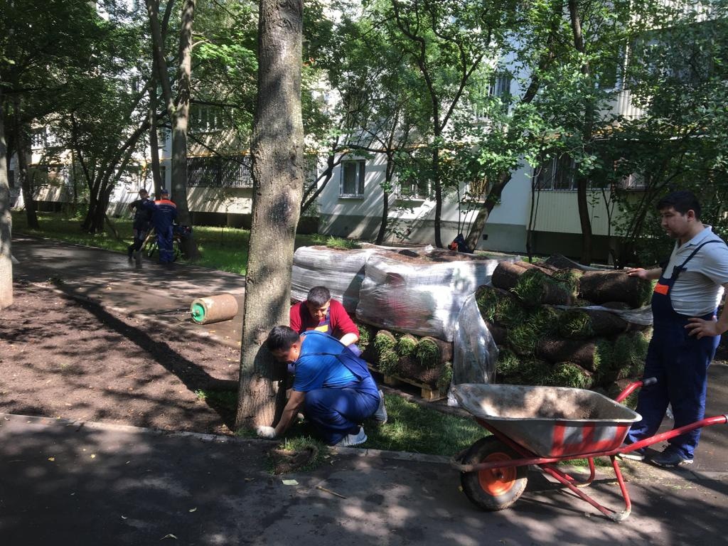 Восстановления газона укладкой рулонного газона проводится сотрудниками ГБУ «Жилищник района Коньково» на улице Профсоюзная между домами 105 и 107