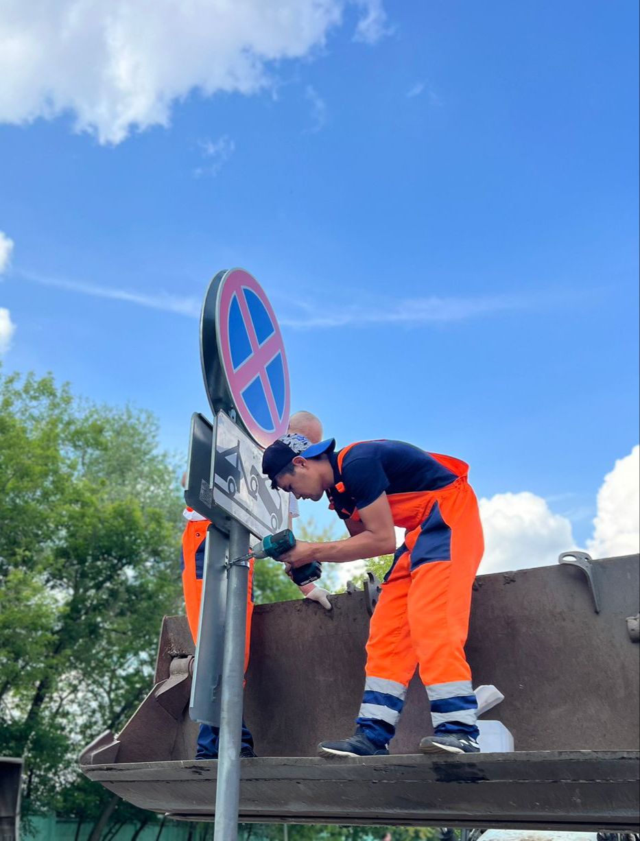 Бригадой дорожных рабочих были проведены работы по установке дорожных знаков 3.27, запрещающих остановку на выезде в автобусный парк.
