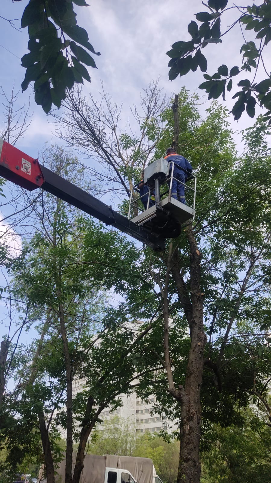 Сотрудниками ГБУ «Жилищник района Коньково» производится санитарная обрезка деревьев, удаление сухих веток около дома 31 ул. Островитянова