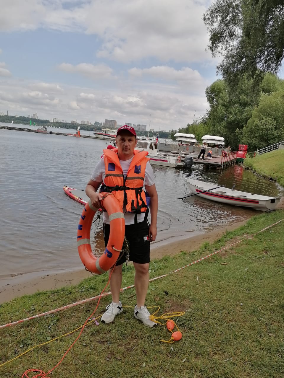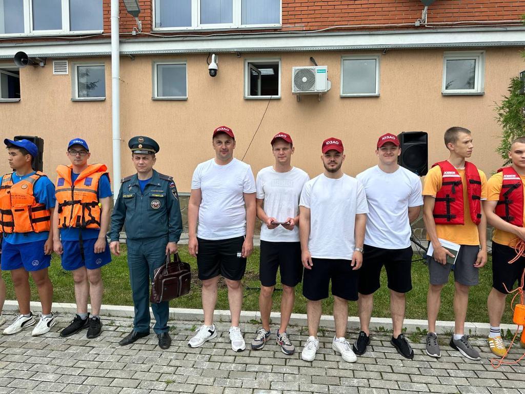 Специалист отдела ГОЧС и ОТ участвует в городских соревнованиях общественных спасательных постов 8 июля 2023 г. Участники команды — добровольные матросы-спасатели.