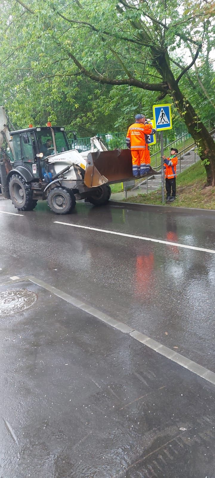 Бригадой дорожных рабочих установлены дорожные знаки «Пешеходный переход» с флуоресцентной окантовкой.