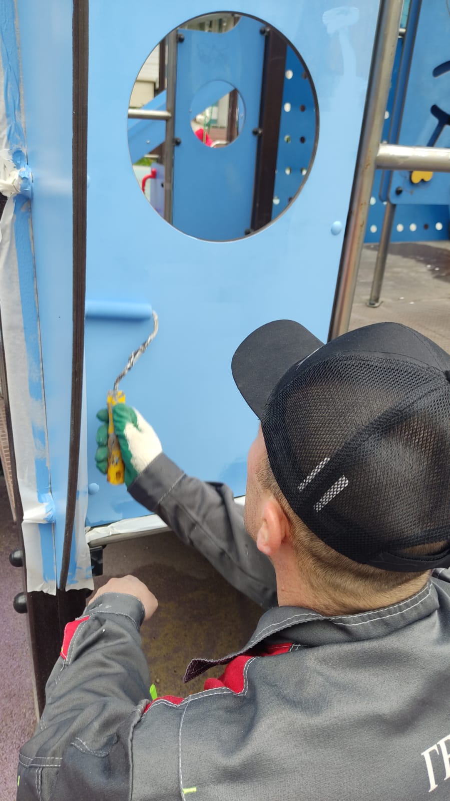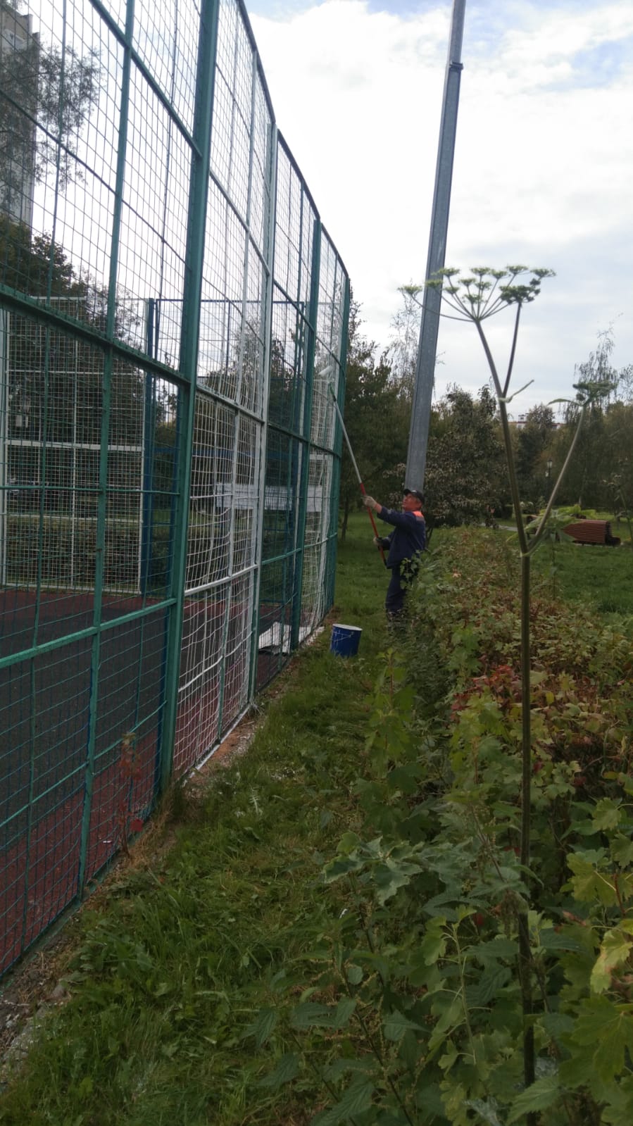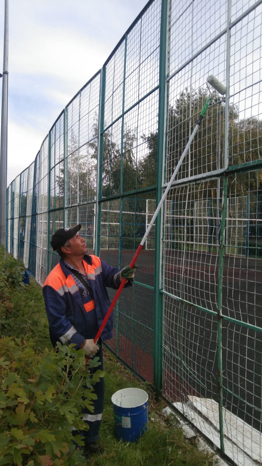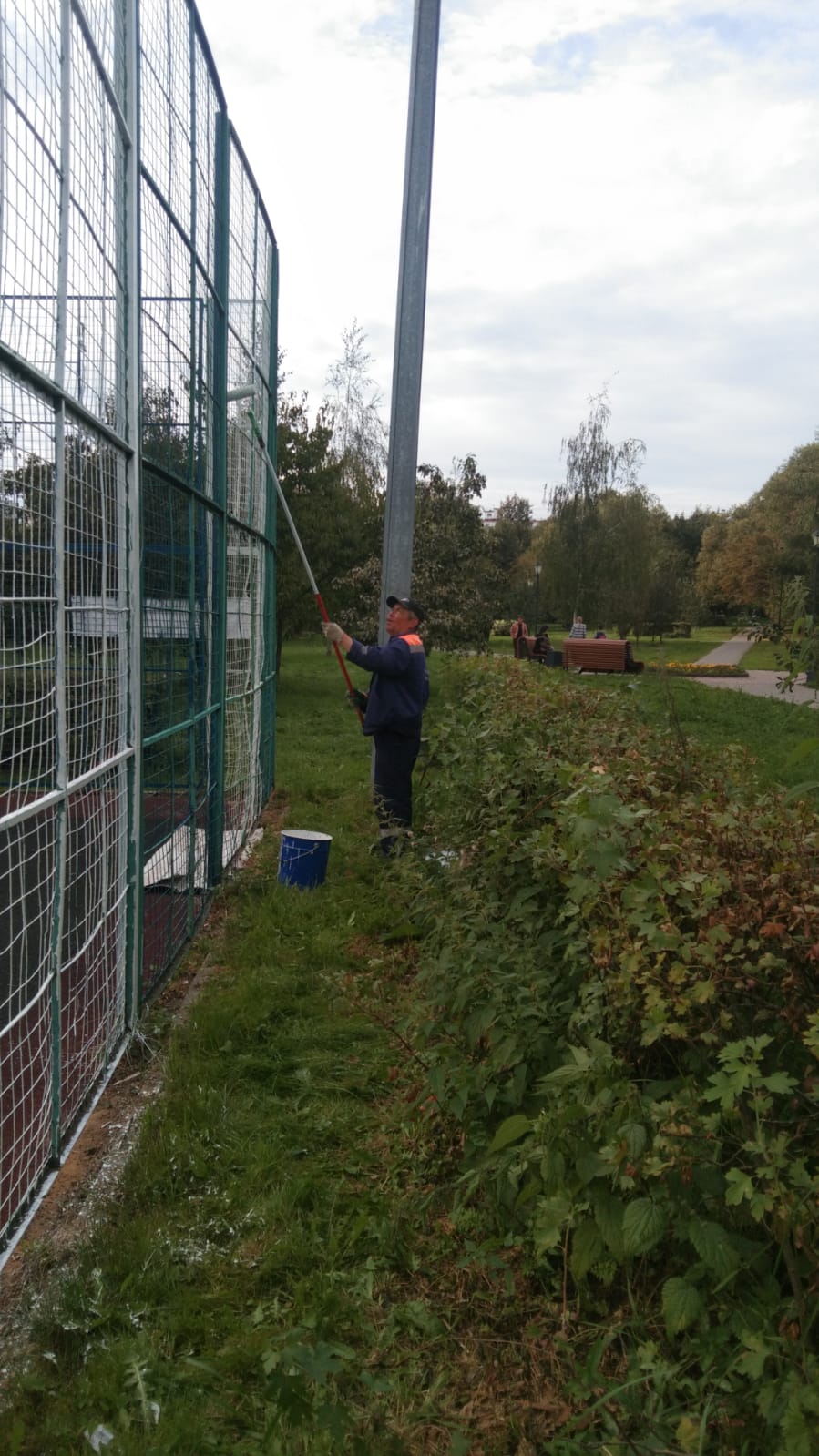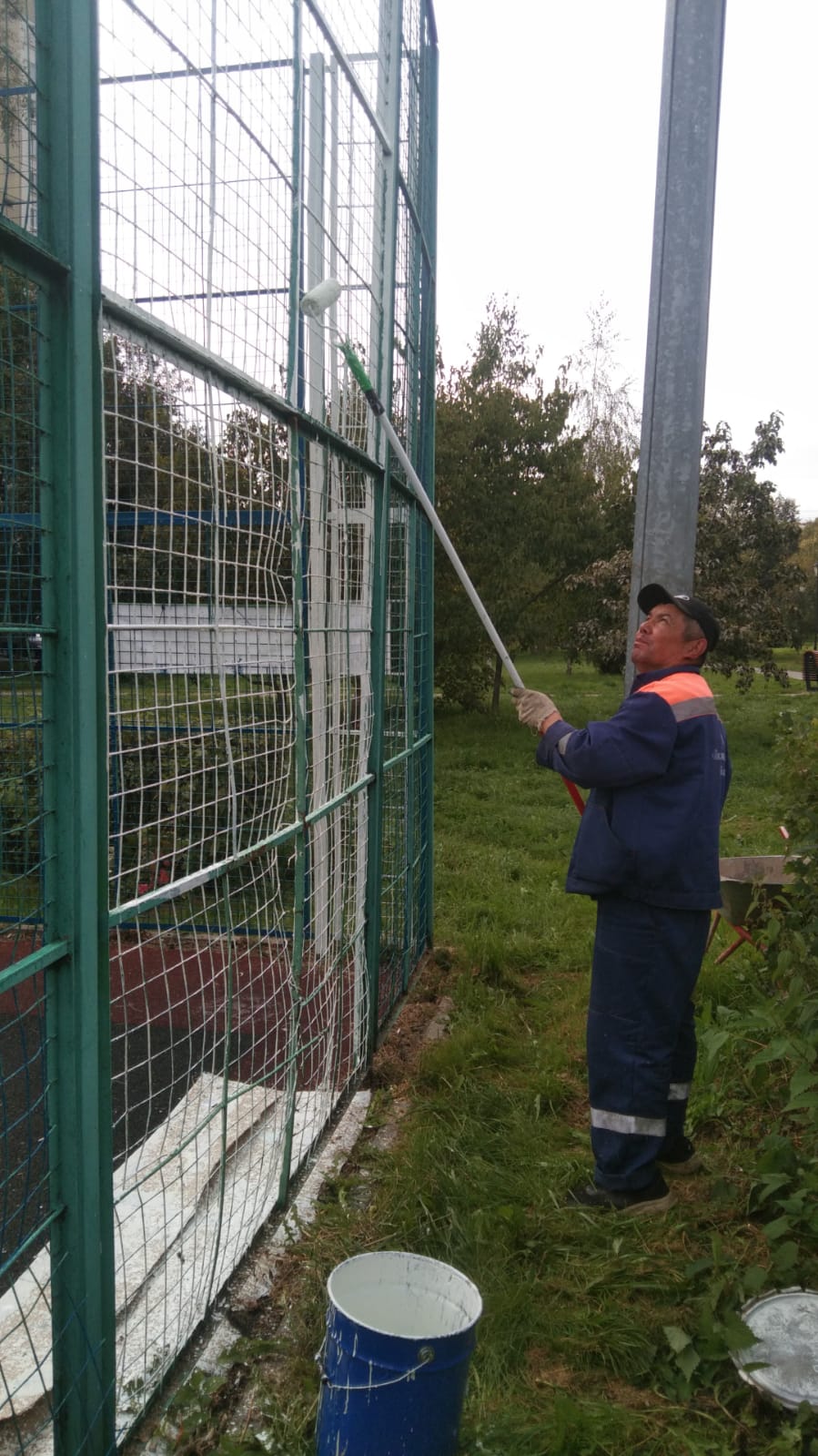 Сотрудниками ГБУ Жилищник района Коньково проведены работы по покраске и частичной замене сетки на спортивной площадке.