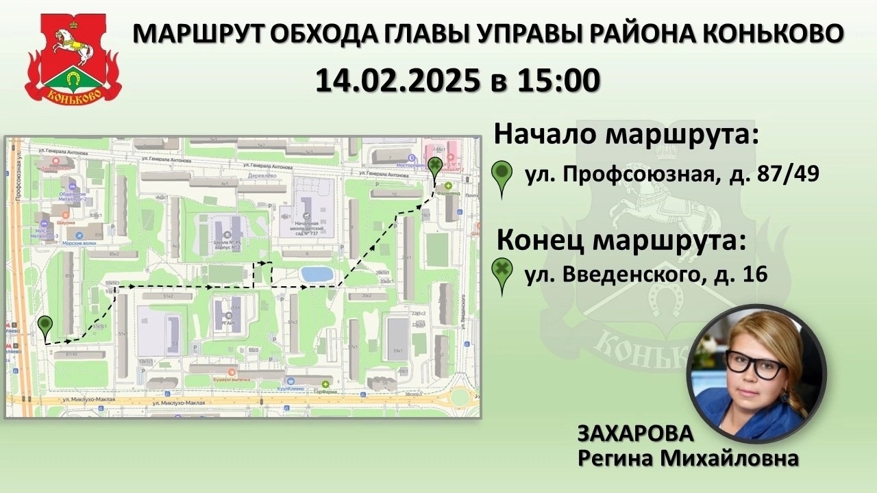 🏡 14 февраля в 15:00 глава управы Регина Захарова совместно со своими сотрудниками управы района Коньково и сотрудниками ГБУ «Жилищник района Коньково» проведет обход территории участка №3.