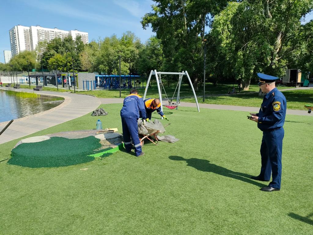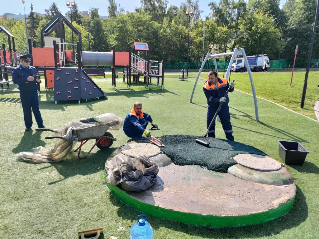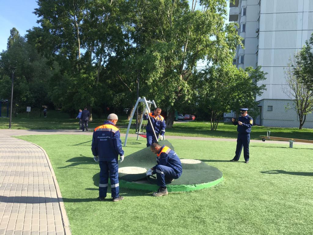 Для безопасного пользования, на детской площадке, расположенной по адресу улица Введенского дом 28, проводятся работы по восстановлению резинового покрытия совместно с представителями ОАТИ города Москвы