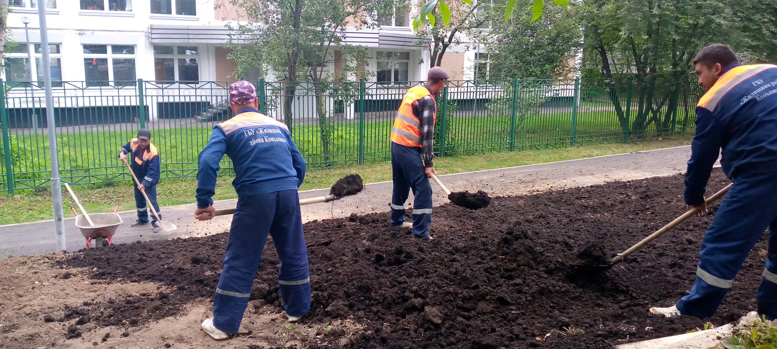 Сотрудниками ГБУ «Жилищник района Коньково» проводится восстановление плодородного слоя земли на газоне около дома на ул. Островитянова д. 34/2