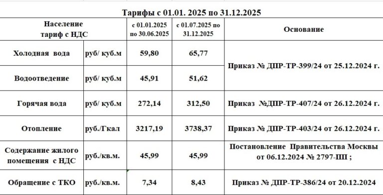 Уважаемые жители! ГБУ «Жилищник района Коньково» информирует Вас об изменении тарифов за жилищно-коммунальные услуги с 01.01.2025 г.